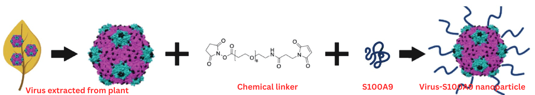 The cowpea mosaic virus (CPMV) is extracted from plants and chemically linked to the S100A9 protein to create the virus nanoparticle. Credit: Young Hun Chung et al., 2023 CC BY-NC-ND.